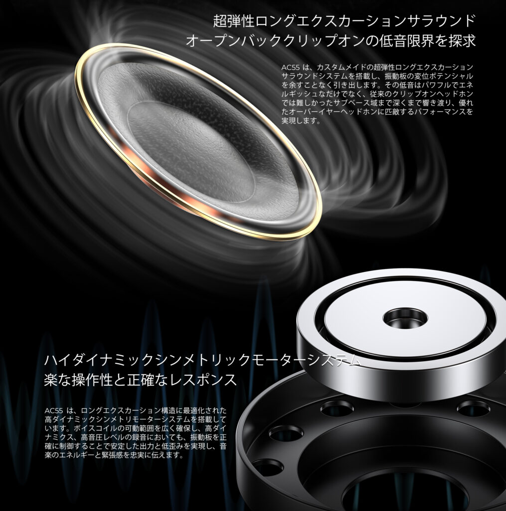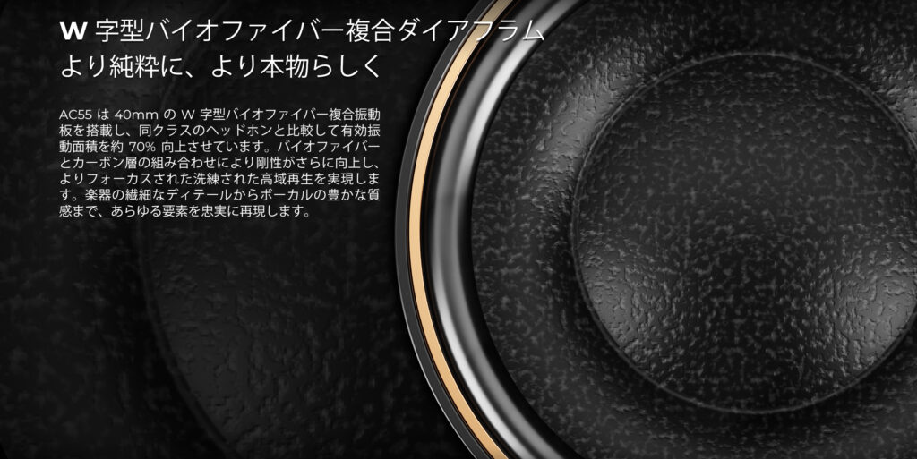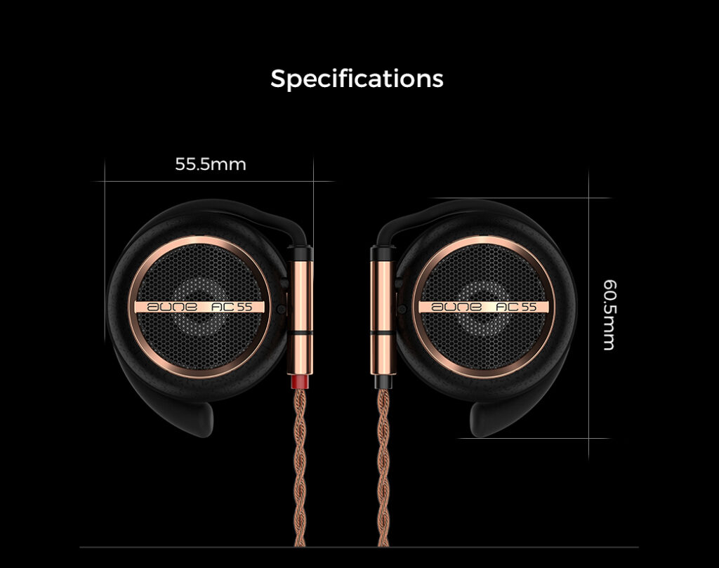 そんな中、今回ACシリーズが始動しました。世代によっては懐かしいと感じる耳掛け式のヘッドセットAC55が登場です。以前の耳掛け式ヘッドフォンはいわゆるオーバーヘッドフォンまでは行かない、気軽に使えるヘッドセットという立ち位置が多かったと思いますが、aune audioのAC55は現在のテクノロジーを詰め込んで本気で作ってみた耳掛け式ヘッドフォンとなります。40mmの大型ダイナミックドライバーはカーボンとファイバーのハイブリッド・ダイアフラムを搭載し、リニア・マグネットとW型ダイアフラム形状で歪みを徹底的に抑えました。また、0.78mm 2pinインターフェイス採用でリケーブルにも対応し、ケーブル・プラグも3.5mm/4.4mmのスイッチ式を採用。バランス/アンバランス接続に対応しています。