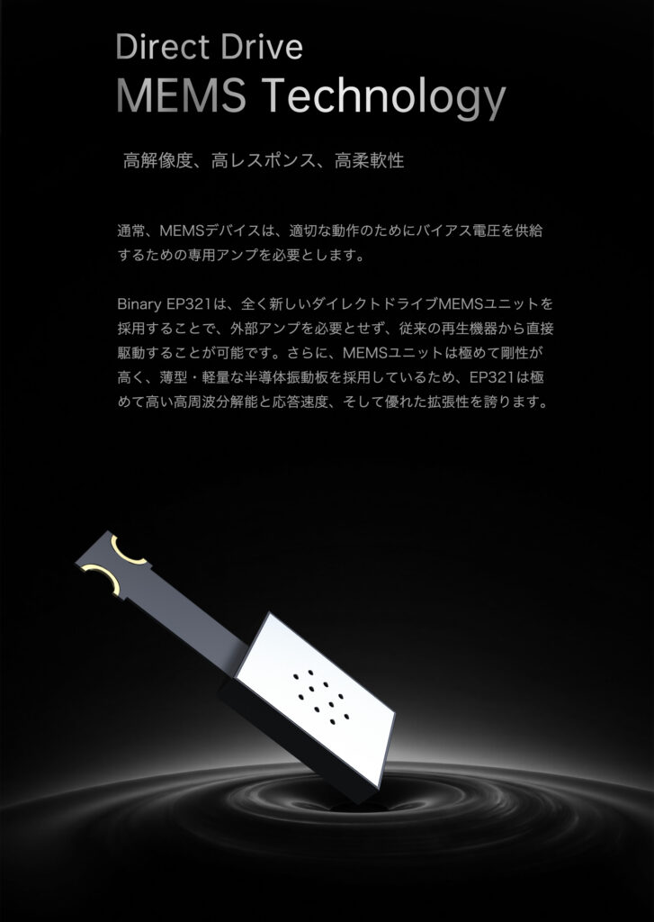 EP321では、新開発のダイレクトドライブMEMSユニットを採用することで、外部アンプを必要とせず、一般的な再生機器からの直接駆動を可能にしています。