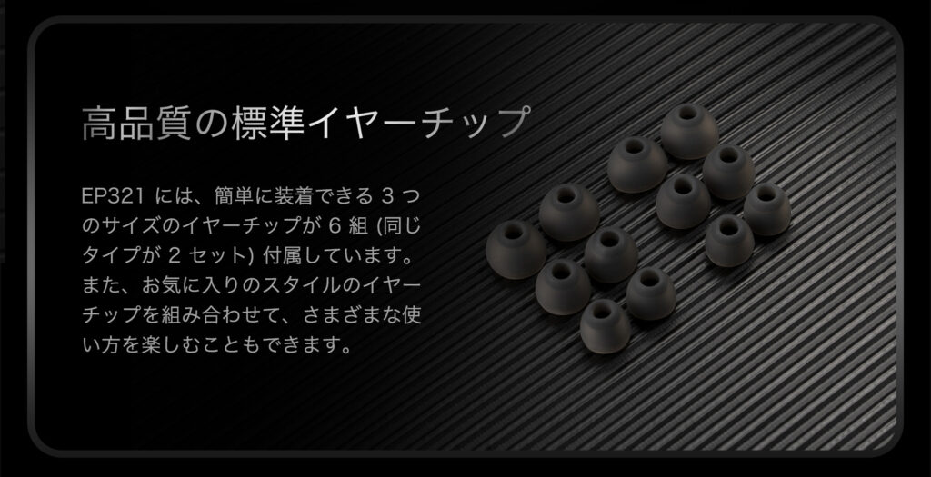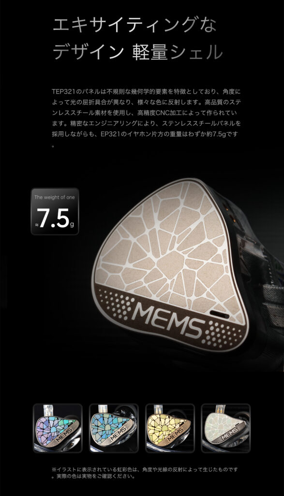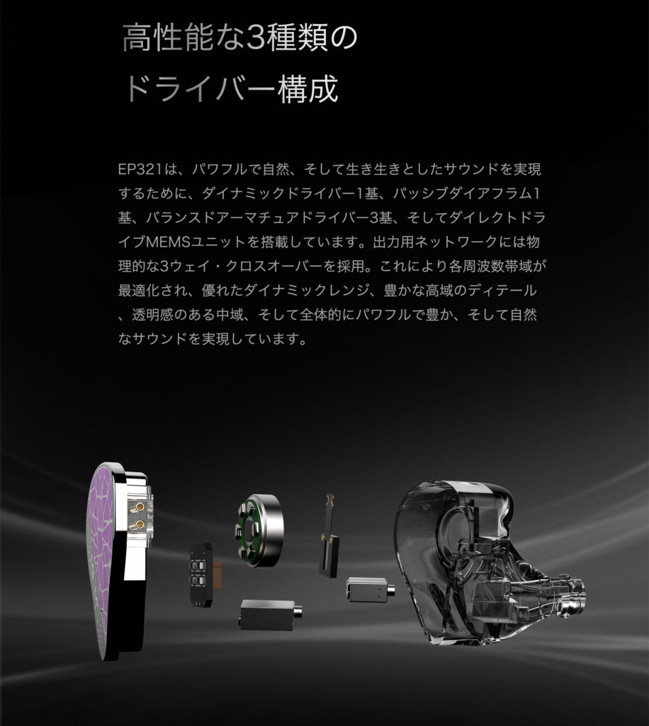 EP321は、ダイナミックドライバー、パッシブダイアフラム、3基のバランスド・アーマチュア、そしてダイレクトドライブMEMSユニットを組み合わせた構成を採用。