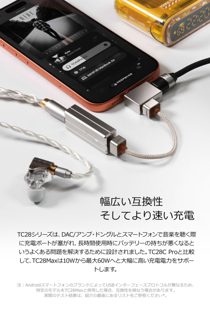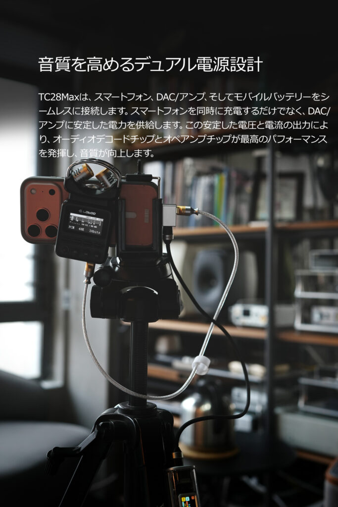 TC28Maxは、スマートフォン、DAC/アンプ、そしてモバイルバッテリーをシームレスに接続します。スマートフォンを同時に充電するだけでなく、DAC/アンプに安定した電力を供給します。この安定した電圧と電流の出力により、オーディオデコードチップとオペアンプチップが最高のパフォーマンスを発揮し、音質が向上します。