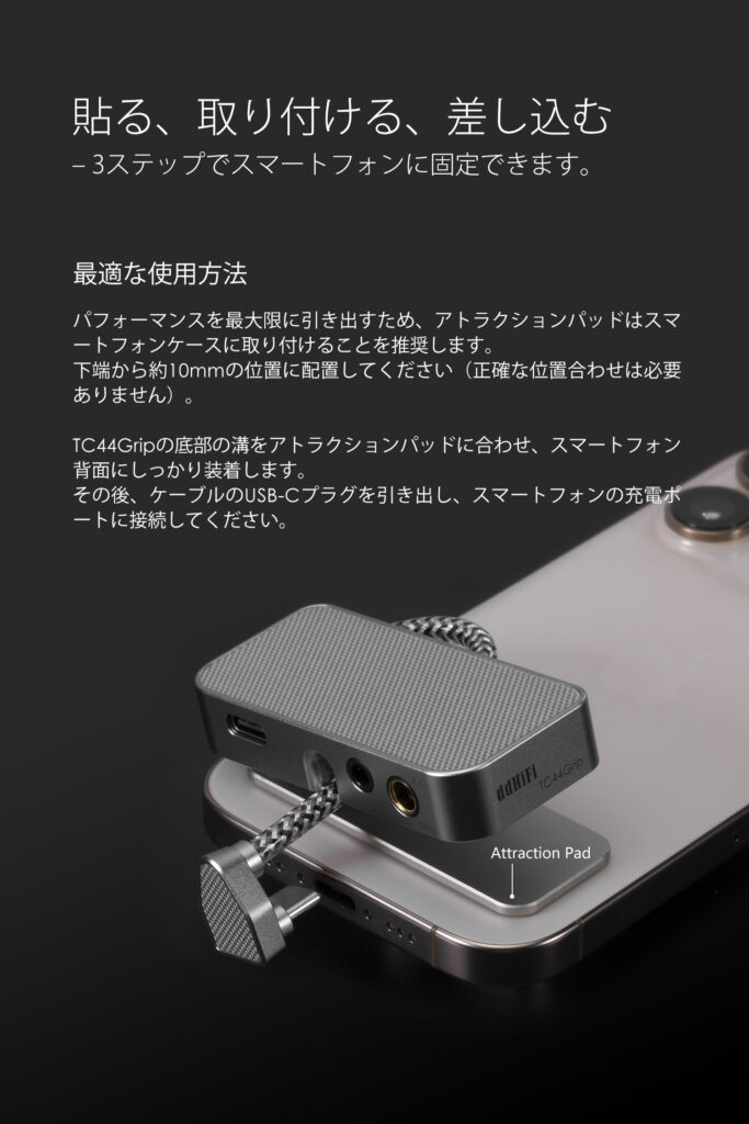 ポータブル・ドングルタイプのDACアンプの新しい形としてddHiFiが提案するもので、スマートに、且つ便利にお使い頂けるようにスマートフォンの背面に取り付けることができ、また配線も非常にすっきりとおさまる“こういうのあったらいいな”を体現しています。