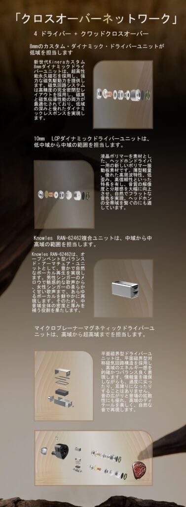 8mmカスタム・ダイナミックドライバーが低域を担当し10mm液晶ポリマーダイアフラム・ダイナミックドライバーが全帯域を担当。KnowlesカスタムBAが中域の厚みを担当。マイクロプラナードライバードライバーは高域のディテールを担当しています。トータル4ドライバーをクワッド・クロスオーバー・ネットワークでコントロールする本格派。